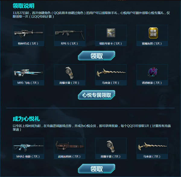 11月27日起,首次创建角色(QQ此前未创建过角色)的用户可以领取新手礼,心悦用户可额外领取心悦专属礼,仅限领取一次(以QQ号码计算)