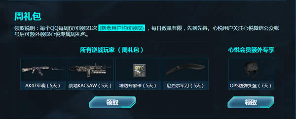 领取说明:每个QQ每周仅可领取1次(新老用户均可领取),每日数量有限,先到先得。心悦用户关注心悦微信公众帐号后可额外领取心悦专属周礼包。