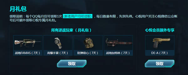 领取说明:每个QQ每月仅可领取1次(新老用户均可领取),每日数量有限,先到先得。心悦用户关注心悦微信公众帐号后可额外领取心悦专属月礼包。