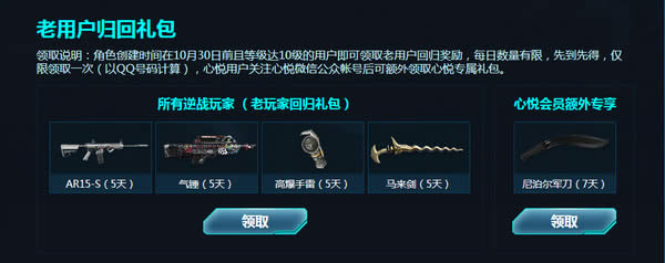 领取说明:角色创建时间在10月30日前且等级达10级的用户即可领取老用户回归奖励,每日数量有限,先到先得,仅限领取一次(以QQ号码计算),心悦用户关注心悦微信公众帐号后可额外领取心悦专属礼包。