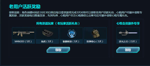 领取说明:角色创建时间在10月30日前且每日登录游戏完成3次对局可以领取老用户活跃礼包,心悦用户可额外领取专属奖励,活跃奖励每日限量发放,先到先得,心悦用户关注心悦微信公众帐号后可额外领取心悦专属礼包。