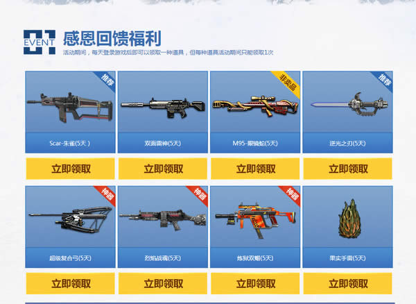 活动期间,每天登录游戏后即可以领取一种道具,但每种道具活动期间只能领取1次
