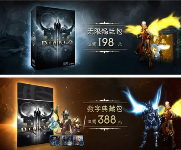 和技术测试阶段一样,公测后所有玩家可以免费使用五大英雄职业,畅玩前四幕剧情故事,并在游戏内升至70级。而购买了198元无限畅玩包的玩家则将解锁圣教军职业、第五幕剧情和冒险模式玩法,还能获得包括死神之面头像框在内的虚拟宝物奖励。而购买388元数字典藏包的玩家,除了能得到无限畅玩包的全部福利,还可获得包括天使之翼、幽灵犬、职业旌旗在内的各种暗黑3虚拟好礼,以及《魔兽世界》中的魔卒萨满和盗宝地精这两个非战斗宠物、《星际争霸II》中的暗黑3主题战网头像及印花、《风暴英雄》中的英雄角色“猎魔人维拉”等跨游戏奖励。公测后30天内购买无限畅玩包或数字典藏包的玩家,还可额外获得一份专属的游戏内奖励:勇气之翼。