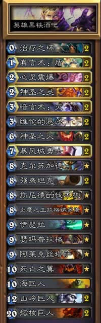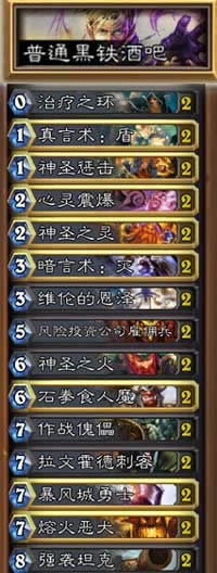 作为第一个副本的第一个BOSS,黑铁酒吧并没有太大的难度。BOSS在每个回合开始会自动释放技能,从双方牌库各自拉出一个随从(要注意是从牌库中)。玩家只需在卡组中放高质量随从和法术,起手留下法术便能轻松过关。这里贴出此BOSS的蓝白卡组,玩家可以在卡组中添加各种高费橙卡、巨人等优质生物,可以帮助更轻松的解决这个便当。