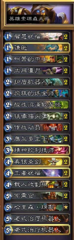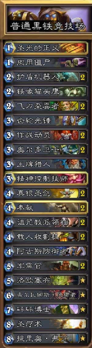 普通难度BOSS起手只有1点法力水晶,前期都是一些比较逗B的橙卡(钓鱼王、米尔豪斯、工匠大师等),主要精力放在应对英雄技能上,所以我推荐使用能轻松补刀并且不惧怕大多数橙卡的圣骑士。