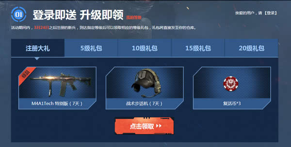 活动期间内,3月24日之后注册的新兵,到达指定等级后可以领取相应的等级礼包,礼包将直接发至你的仓库。