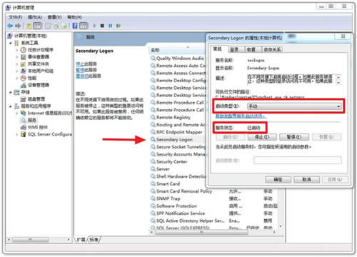 然后找到SecondaryLogon服务,若该服务被禁用,请将设置为手动