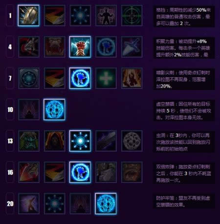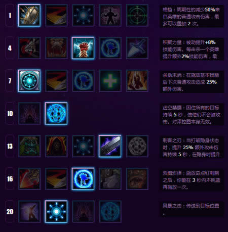 智能囚禁可以在乱军之中安全地救下被围攻的队友。而风暴转移可以让你用E追击敌人后安全撤离。一般和第5层天赋对应:刺客之刃配风暴转移,虫洞配智能囚禁。