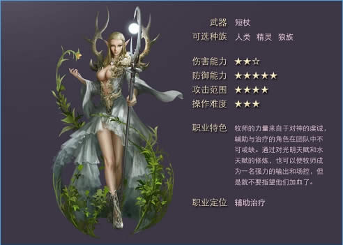 牧师的力量来自于对神的虔诚。五大种族中只有人类和精灵有着坚定的信仰,虽然崇拜着不同的神,但是辅助与治疗的能力殊途同归。