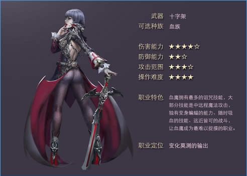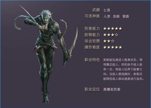 终日与黑暗为伴的刺客热爱轻便的武器,习惯使用灵便的攻击手法。只有人类和血族满足成为刺客的条件。