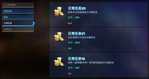 “使用一个刺杀型/战斗型/辅助型/专业型英雄在任意模式完成两局游戏”现在变成“使用一个刺杀型/战斗型/辅助型/专业型英雄在任意模式完成三局游戏”。完成成该任务的奖励从200金币增加到300金币。