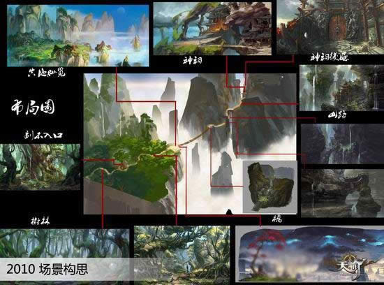 《天谕》在2010年最初构想中,开发团队试图将东方的元素与西方的元素融合起来,创造一个独特的游戏世界。如图所示,陡峭的悬崖和独木桥充满了“蜀道难”的味道,而树林的设计则更偏向西方童话中的场景,树木姿态更加夸张有张力。
