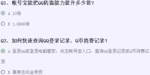答案:A 登录QQ或登录电脑管家,点击帐号宝入口,查询QQ登录记录或Q币消费记录