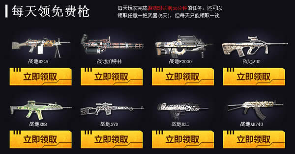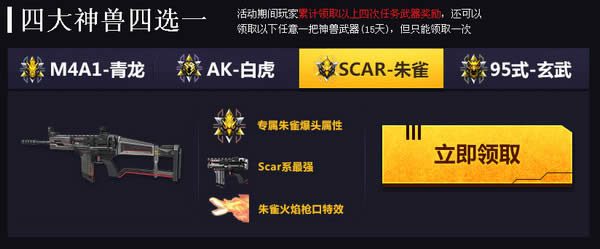 3、如您当天没有成功抢得麒麟AR15的体验资格,但完成当天的游戏任务,您还可以免费领取一把战地系列武器,累计四次完成任务四大神兽任选其一,同时您还可获得第二天抢得麒麟AR15体验几率的提升5%,但几率不叠加;