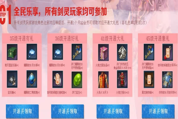 2.所有剑灵玩家游戏角色达到对应等级后,开通1个月QQ会员可领取对应开通大礼包一份。(各礼包单Q限领1次)