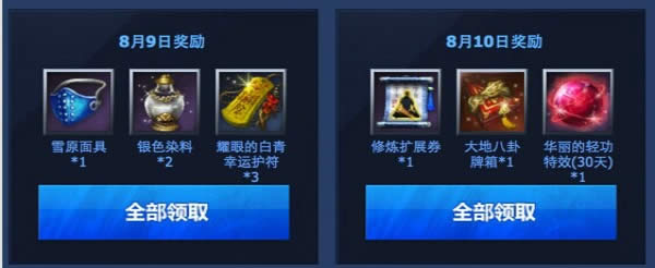 8月9日,8月10日,每天从21到22点一直保持在线,即可在8月11日领取礼包