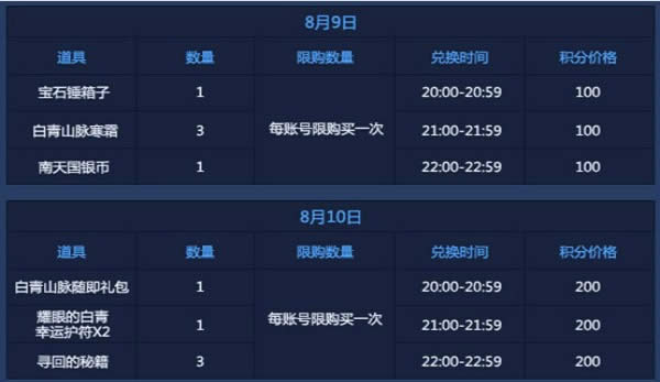 8月9日,8月10日,每隔1小时,网吧积分商城限时限次开启奖励兑换。