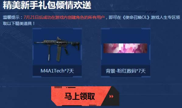 7月21日后成功在游戏内创建角色的所有用户,即可在《使命召唤OL》游戏人生专区领 取以下精美道具!