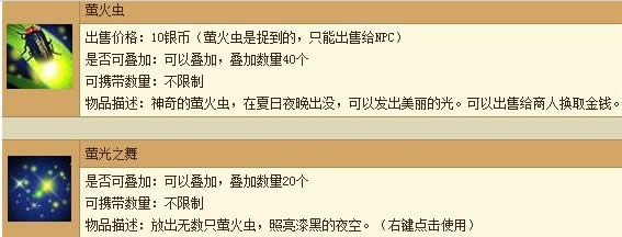点击萤火虫,可以捕捉到萤火虫,而且有一定几率可以得到萤火虫烟花,萤火虫可以卖给商人包世荣苏州[189,168],可以得到金钱,在结婚戒指升级的任务中也需要一定量的萤火虫。使用烟花,绽放出华丽的萤火虫效果。