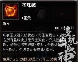 现在到了我们讨论整个输出循环里面最核心的技能了,圣珠破,这个不是三圣诀里面的技能,但这是一个让三圣诀得到质变的技能,这个技能极大提升了圣僧的dps,无论是爆发,还是伤害,但是也极大限制了圣僧的dps,就是冷却时间还有技能前摇,神将能刷新这个技能。
