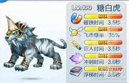 小编点评:糖白虎的技能是任意奖励关卡中得分3倍;开局冲刺700米;终极冲刺。在炫飞模式中占着绝大的优势,金币钻石滚滚而来!