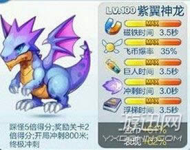 小编点评:紫翼神龙的技能是双技能,不仅可以踩怪5倍得分,在超级关卡的时候还可以获得2倍积分加成的奖励。其实和糖白虎技能差不多,但是相比之下还是糖白虎拥有高分略胜一筹。