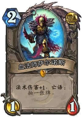 血法师萨尔诺斯:看起来并不是“最酷”的传说级橙卡,但效果确实很好。你可以利用自己的移除类法术来和法术增益打COMBO,如果它死了,还能抽一张牌。