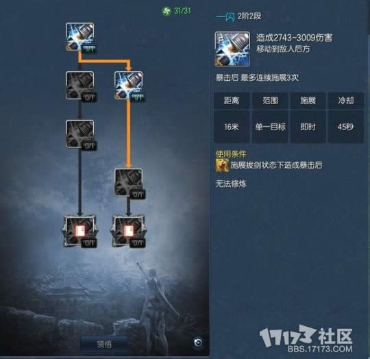 一闪点右边第二列,2点,这样一闪就变成单体技能,自动闪到BOSS身后,暴击后可以多施展一次,最多3次。