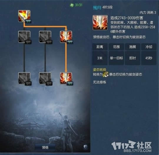 V键的风月斩,点第三列,转变为残月,这次更新的两大神技第二神技,暴击的时候可以进入拔剑状态,灵剑的第二种进入拔剑状态的技能,当然触发效果比较坑爹,需要暴击才能触发。