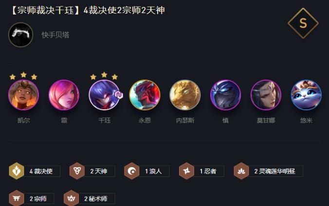 四裁决使羁绊会对生命值为99%的敌人造成暴击,让核心英雄和凯尔的输出能力大涨,装备给到后可快速收割战场,再搭配上宗师和秘术羁绊来提升阵容的坦度,综合下来强度非常大。