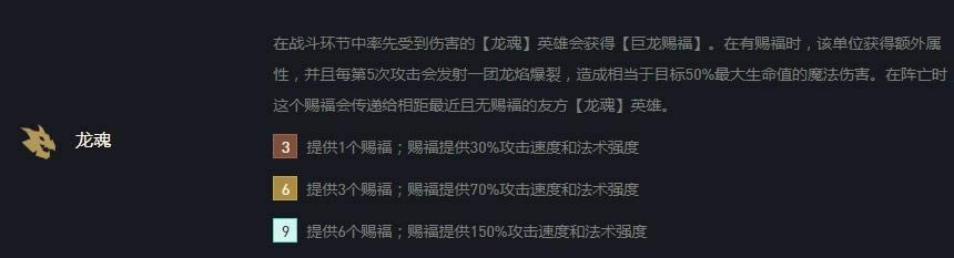 在此之前让我们看下龙魂羁绊:在战斗环节中率先受到伤害的【龙魂】英雄会获得【巨龙赐福】。在有赐福时,该单位获得额外属性,并且每第5次攻击会发射一团龙焰爆裂,造成相当于目标50%最大生命值的魔法伤害。在阵亡时,这个赐福会传递给相距最近且无赐福的友方【龙魂】英雄。