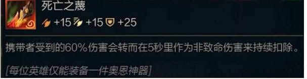 死亡之舞是一个十分强力的输出型装备,他能够把携带者收到的伤害转换成非致命伤害来持续扣除。推荐搭配给奥拉夫等拥有吸血能力的输出棋子,一边吸血一边抑制掉血,四舍五入等于不掉血。