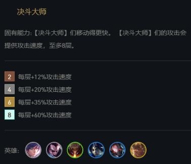 决斗单位可以快速地提升自身的攻击速度,战斗节奏偏快,启动速度也快,在前期可以帮助劫更好地过渡。决斗大师羁绊在前中期也有很高的强度,搭配上一个凯隐和劫又能弥补后期输出乏力、强度不够等问题。