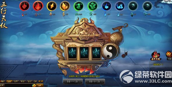 1、 每日可通过免费次数和元宝次数进行五行资源抽取,出现两个或三个相同图案即可获得奖励