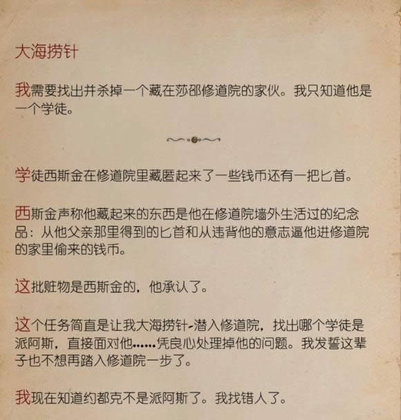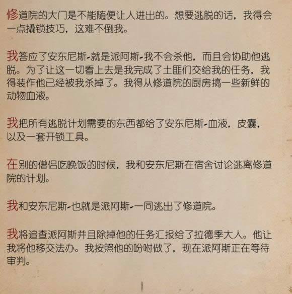 进入修道院,跟安东尼斯对话,跟他说明你的来意是来找杀人犯的。