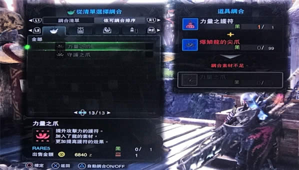 合成的方式很简单别看99那是上限,其实只需要一个爆鳞龙的尖爪+力量护符,即可合成。守护爪雷同。