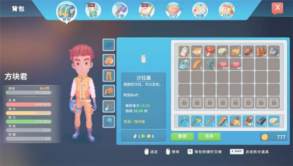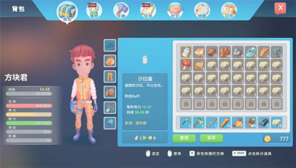 先打开你的背包,然后把刚刚挖掘的石头或者沙子拆分开直到塞满你的背包。