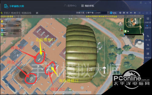 尽量落在图中红色1的地方,以最快时间降落,鸟瞰一下四周的大致降落情况好判断攻防重点方向。然后迅速边捡资源边往建筑二楼撤离,以免待太久被来自其它建筑顶层的玩家淘汰。如果其他玩家距离比较近,去楼梯口怕来不及,可以从红点这个地方天窗下去。