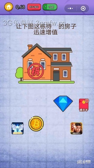 微信燃烧吧我的大脑第68关是让下图这栋待拆的房子迅速增值。难度比较简单,那么微信燃烧吧我的大脑第68怎么过呢?下面将给大家带微信燃烧吧我的大脑第68关答案。