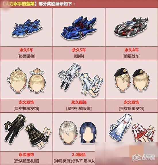 活动期间,购买角色经验卡+900,有机会得永久S车【终极猛兽】/【猛兽】、永久A车【蝙蝠战车】、永久【星空机械发饰/服饰】/【贵柒黯墨发饰/礼服】或其他奖励之一!