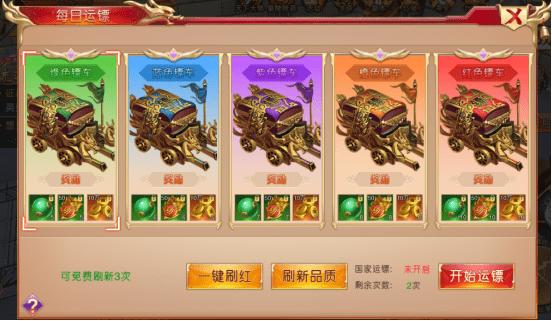 2、镖车品质分为:红>橙>紫>蓝>绿,每日将军可免费刷新3次镖车品质,超过3次则需要消耗运镖令进行刷新,当镖车为红色最高品质时,将无法再通过刷新提升,品质越高奖励越高;