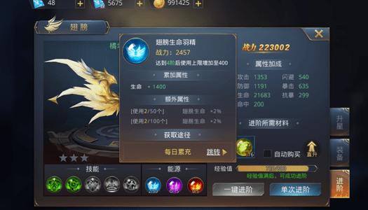 可以使用三种坐骑兽元来提高坐骑属性,翅膀生命羽精属性丹运营活动使用后生命增加200点,有使用上限(受进阶等级影响);翅膀防御羽精属性丹运营活动使用后防御增加40点,有使用上限(受进阶等级影响);翅膀攻击羽精属性丹运营活动使用后攻击增加50点,有使用上限(受进阶等级影响)。