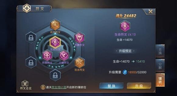 通过完成符文塔闯关副本,可对符文系统进行解锁并获取符文。符文可镶嵌在已解锁的符文槽内,并为觉醒者带来对应的属性加成。多余的符文可进行分解操作获得符文精华,并用作符文升级,提高符文为觉醒带来的对应属性加成。