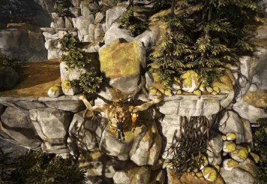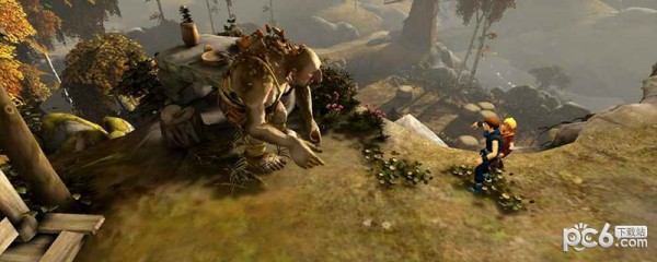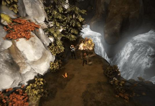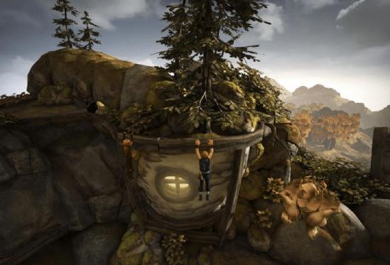 通过农舍之后经过刚在路过的粮仓的上方,会看见一个在哭的巨人,剧情结束之后,跟着巨人走,巨人会帮助兄弟二人翻过路上很多的障碍,踩着巨人肩膀过河后,爬到对面的枯藤上,等待巨人从下面爬上来在从巨人肩膀上爬过,让巨人江兄弟二人扔至对面后,爬到一个平台上,等巨人两手张开后与他互动,巨人会带着兄弟二人跳下瀑布。
