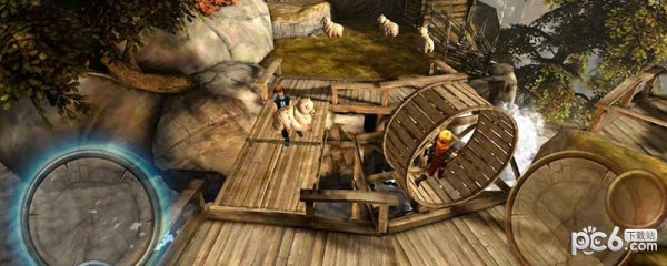 剧情结束后,兄弟两人出门下山,有人挡着一座桥不让兄弟二人过去,无奈,兄弟二人只好从右侧小河游过去,到岸后爬上枯枝到正前方可攀登的绿色岩石处,爬上去后跳过一个间隙,爬上正前方的木头横梁进入村子。