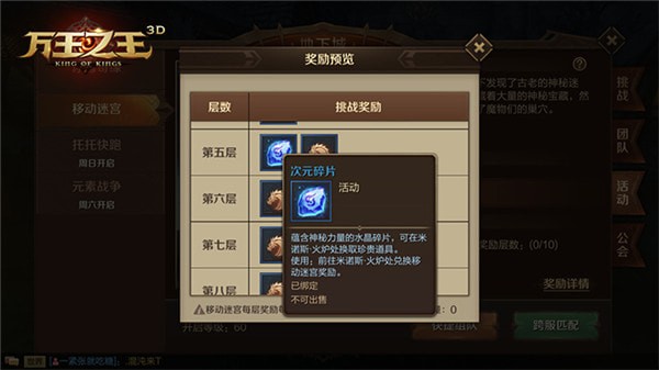 移动迷宫副本在地下城副本的活动界面中,玩家等级达到60级以后才能组队参加。这是一个非常公平的副本,也是一个考验玩家操作的副本。在这里玩家等级默认为1级,需要玩家通过击败魔物获得经验来升级。击败魔物的同时还可以收集魂晶,魂晶可以用来买装备和道具。移动迷宫一共有十层,每通关一层将会获得一份奖励,也就是说,通关层数越高,奖励越多。但需要注意的是,移动迷宫副本不限制参加次数,但每层的奖励只能拿一次。