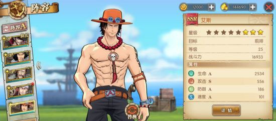 首先,艾斯是SSR角色,基础的属性就比SR和R高,攻击力是S,属于一位后排输出角色。