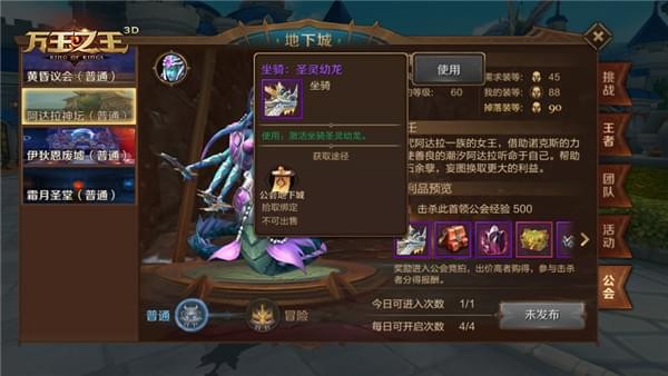 公会副本是在工会建筑“冒险者协会”达到一定等级后才会开启的特定的副本。要开启这个副本需要公会的会长在工会活动界面进行任务添加和发布,活动时间可以根据公会的实际情况来设定,当时间到时,公会成员便可以进入副本中参加该活动。普通的阿达拉神坛副本是一个48级的副本,推荐装备等级45级,通关的时间限定为60分钟。