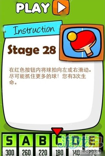 关卡提示:按住红色乒乓球拍并拖动,然后往左边或者右边滑动,来弹飞落下来的乒乓球就可以了,注意你只有三条生命。