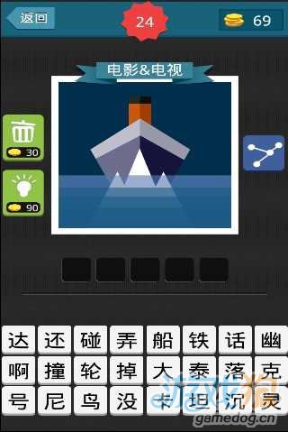 疯狂猜图中,一艘船撞到冰山,看起来像前面有个三角形,蓝色的海水,黄色的汽笛,猜五个字电影电视。答案是:泰坦尼克号。